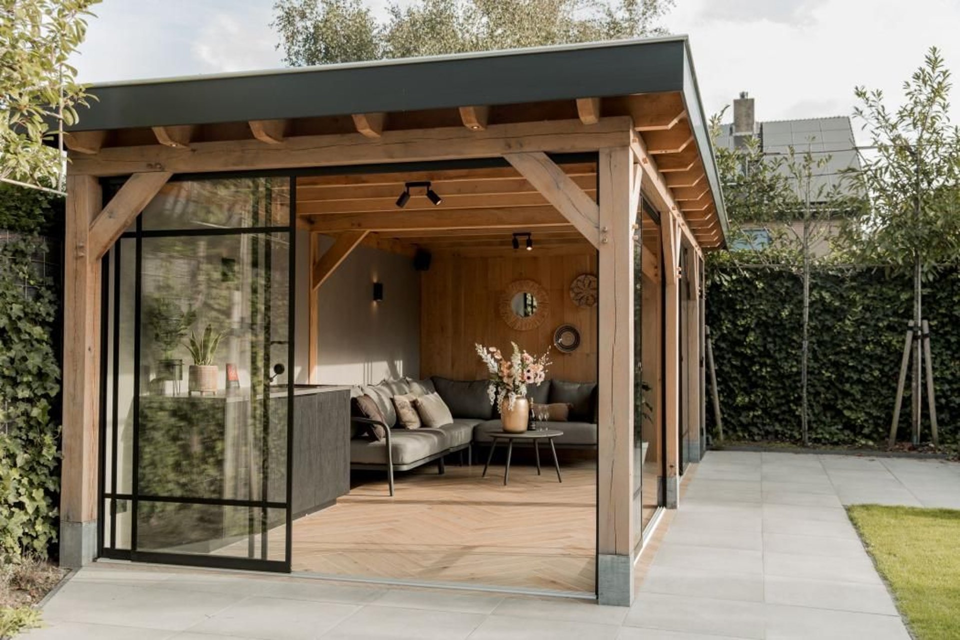 Statybos darbai: Pagrindas (poliai, pamatėlis), karkaso montavimas, stogo dengimas, grindų (terasa) įrengimas, apdailos darbai (suolai, šoninės sienelės).